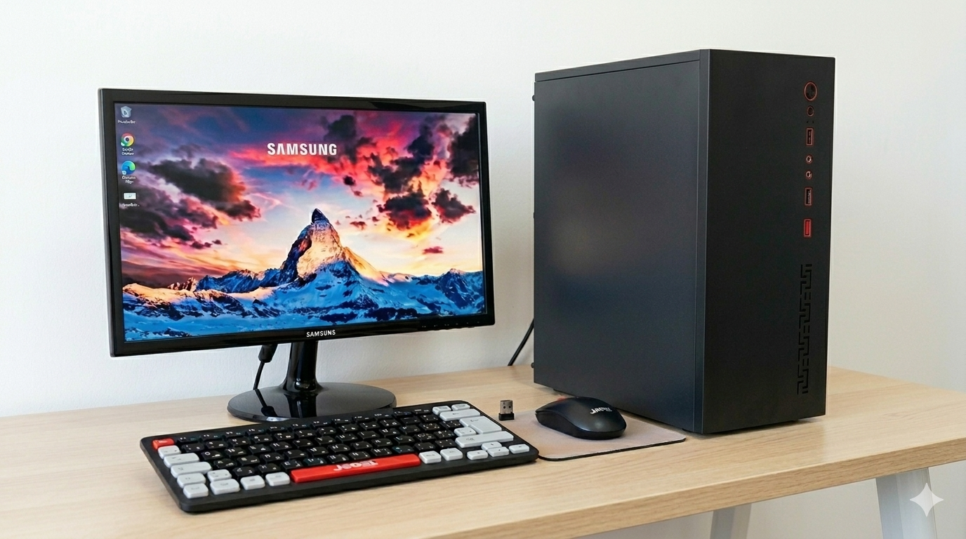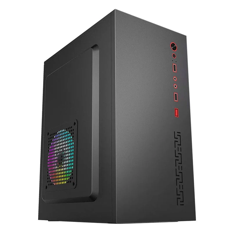 PC de Bureau AFRICANET: Boîtier PC Mini Tour Élégance – Processeur Intel Pentium Silver J5040, up to 3.2 Ghz, 4 Mo de mémoire cache – Mémoire 8 Go – Disque SSD 128 Go + Disque HDD 500 Go – Intel UHD Graphics 605 – Carte mère ASRock J5040-ITX – Clavier et souris sans fil inclus – Ports : 2 x USB 2.0, 1x Sortie audio, 1x Entrée audio – Emplacements d’extension : 5 – Couleur Noir et Rouge